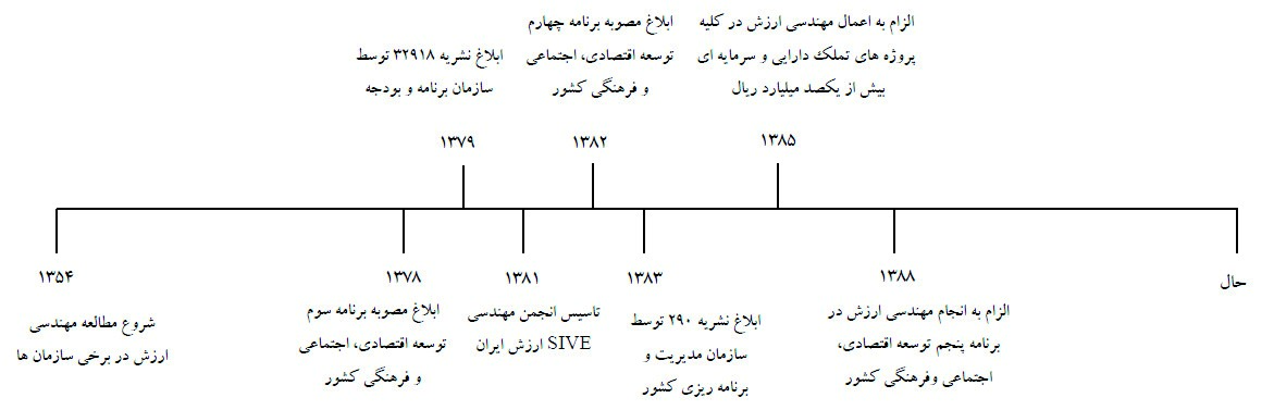 مهندسی ارزش در ایران، در سالهای 1377و 1378 در برخی از پروژههای صنعت نفت و آب، با دعوت از اساتید بینالمللی این حوزه آغاز شد. علاقه حوزههای دانشگاه و صنعت موجب شد تا دانشگاه صنعتی امیرکبیر در سال1379 اولين كنفرانس مهندسی ارزش را برگزار نماید. در همين سال دستورالعمل ارجاع كار و انعقاد قرارداد با واحدهاي خدمات مهندسی ارزش از طرف سازمان مديريت و برنامهريزي (سازمان برنامه و بودجه) ابلاغ شد. در سال1380 اولين كنفرانس مهندسی ارزش در صنعت نفت برگزار گرديد و در همين سال نيز كميته مهندسی ارزش در وزارت راه و ترابري تشكيل شد. درسال1383 در برنامه چهارم توسعه مجدداً بر لزوم اعمال مهندسي ارزش در پروژههاي عمراني تأكيد شد. در همین سال طرح جامع و وسيع پيادهسازي مهندسی ارزش در وزارت راه وترابري (ماورا) آغاز شد و در طي آن بيش از 1000 نفر مورد آموزشهاي مهندسي ارزش قرار گرفتند. در مهرآن سال سازمان مديريت و برنامهريزي وقت شرح خدمات پيشنهاد تغيير به روش مهندسي ارزش و قوانين انگيزشي پيمانكاران را ابلاغ نمود( نشریه 290). اولين همايش مهندسي ارزش در حملونقل كشور باحمایت وزارت راه و ترابری در اواخر تیر ماه 1384 برگزار شد و در آذر ماه همان سال دومين سمينار ملّي مهندسی ارزش در دانشگاه علم و صنعت برگزار گردید. در اواخر سال 1384 دستورالعمل سازمان مديريت در زمينه مهندسي ارزش مورد بازنگري قرارگرفت. با اتمام طرح جامع پیاده سازی مهندسی ارزش درسال1386 سند راهبردي مهندسي ارزش در وزارت راه و ترابري توسط وزیر راه و ترابری ابلاغ گرديد. در ششم آذر ماه سال1387 کنفرانس سوّم مهندسی ارزش با شعار خلاقیّت، نوآوری و توسعه ملّی در دانشکده فنّی دانشگاه تهران برگزار شد و چهارمین کنفرانس ملی مهندسی ارزش در دیماه سال1389 در دانشگاه علم و صنعت ایران برگزار گردید. در برنامه پنجم توسعه که در همین سال ابلاغ گردید الزام به استفاده از مهندسی ارزش در بند ج ماده 214 مجددا مورد تاکید قرار گرفت. توجه متولیان حوزه انرژی کشور به مهندسی ارزش موجب شد تا اولین کنفرانس ملی کاربرد مهندسی ارزش در مدیریت انرژی در خردادماه سال1391 برگزارشود. انجمن مهندسی ارزش تاکنون پنج همایش ملی مهندسی ارزش و ششمین همایش آن در سال 1396 برگزار می گردد. مرجع دانش مهندسی ارزش نیز از سال 1393 سلسله کنفرانس هایی تحت عنوان مهندسی ارزش و مدیریت هزینه آغاز نموده است. این کنفرانس در سال های بعد با دعوت از اساتید بین المللی دارای مدرک CVS، بصورت بین المللی برگزار گردیده است.